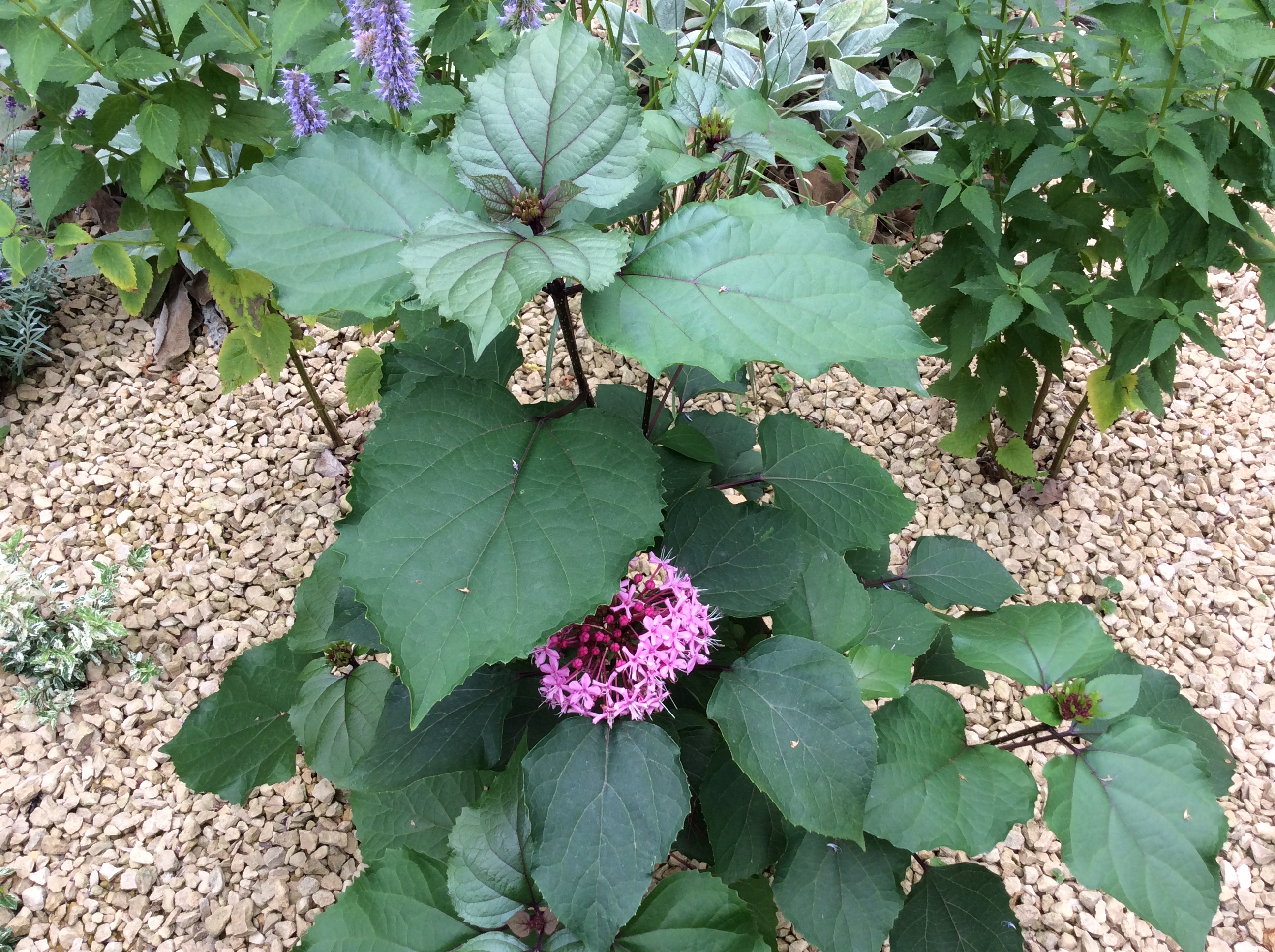 De stermagnolia (Magnolia stellata) en kornoelje (Cornus kousa 'Schmetterling'), die al in de voortuin stonden, doen het nu beter omdat ze minder last van de droogte hebben. Ook de pindakaasstruik (Clerodendrum bungei) die ik afgelopen voorjaar plantte, lijkt goed aan te slaan.